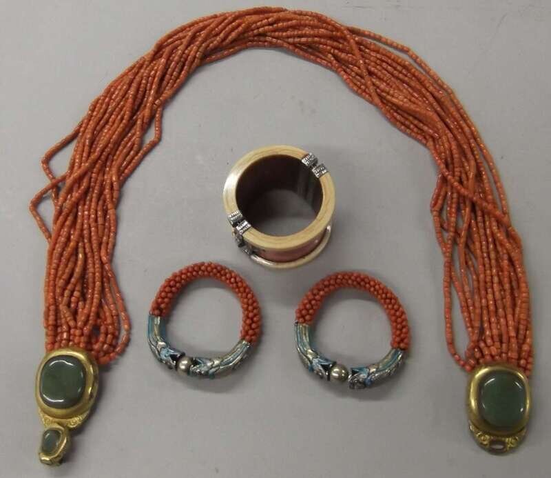 Including four bracelets and a belt with hardstone inset belt buckle.