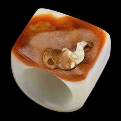 The ring of saddle form with milky tones, the front with russet skin and carved with a bat.
