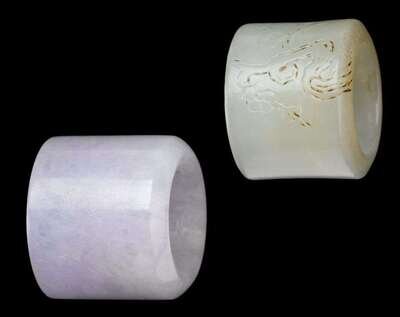 Consisting of a white jade and lavender jadeite ring. Each is of plain cylindrical form. The white jade ring is incised with a small blossoming tree.