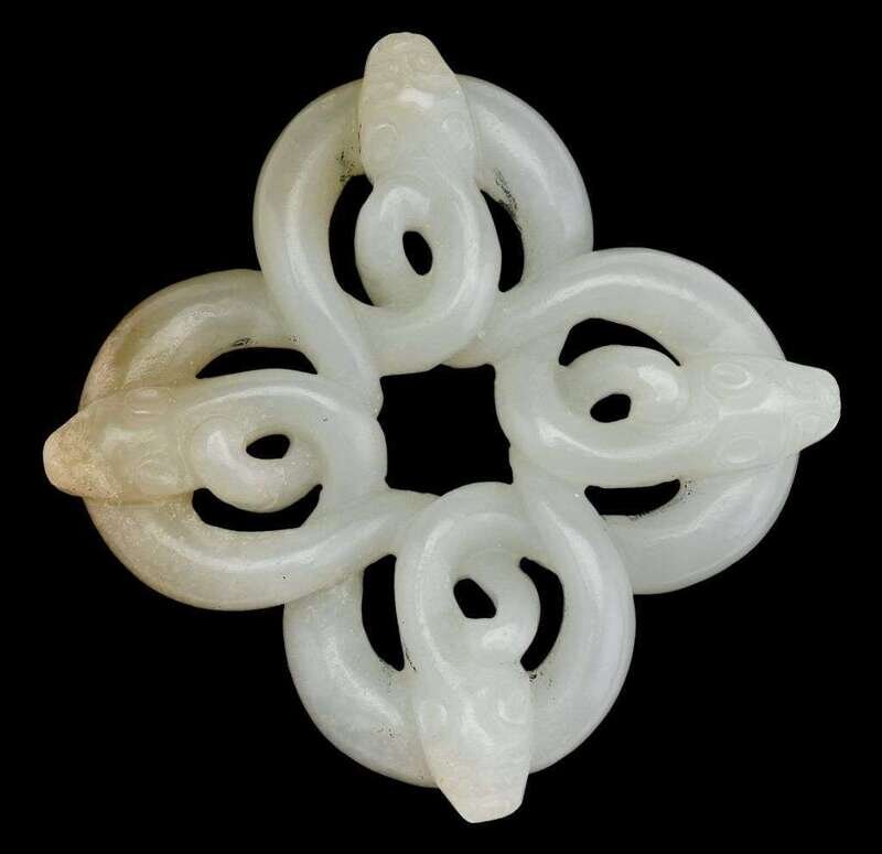 Endless knot coiled dragon form, jade with slight stone inclusion to one corner.