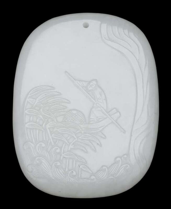 Of ovid form depicting a figure with a long pole on a boat passing through a cluster of reeds along the river, opposite side containing an inscription.