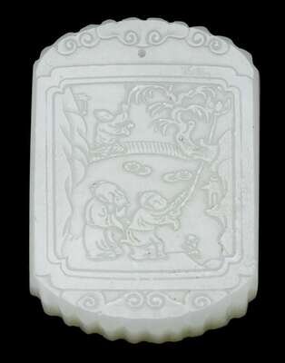 Of rectangular form with various figure and a child with a pole picking fruit from a tree. Inscription on reverse side.
