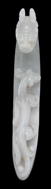 Carved with a curved shaft terminating in a dragon-head hook, opposite a sinuous mythical beast in relief.