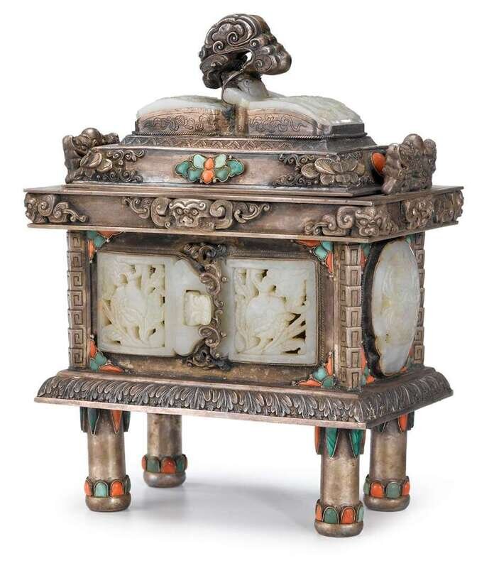 Chinese celadon jade mounted white metal censer mounts 18/19th century