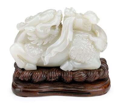 The recumbent beast is shown with a twisted head and a gift box on its back, supported on a wooden stand.