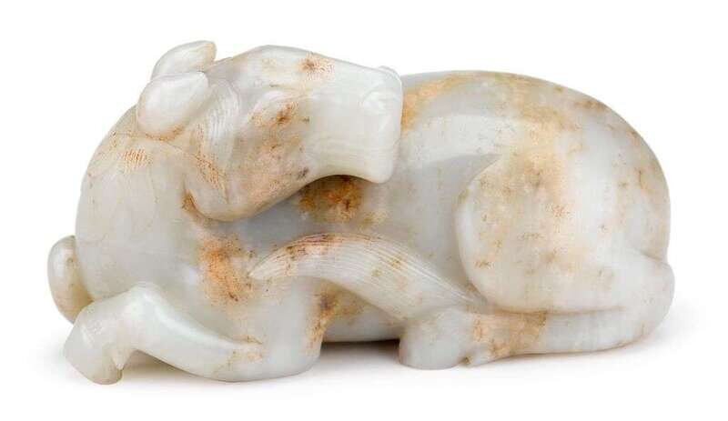 The recumbent horse is shown with a twisted head with a well incised mane, the jade of various russet highlights.