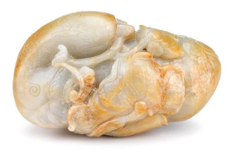 The bird seated in a recumbent pose with its head twisted towards its tail and shown with a lotus branch clasped within its mouth, the flowers draping the bird and falling underneath its body. Its wing, neck, and beak are accented with ornate incisions. The jade of a greenish-gray involving russest inclusions.
