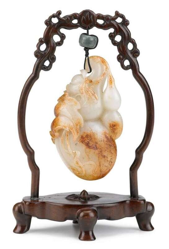 The gourd carved with leafy tendrils and russest highlights, hanging from wooden stand.