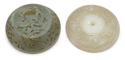 The pair consisting of a celadon jade openwork cover with phoenix decorations and a circular white jade with scrollwork decor.