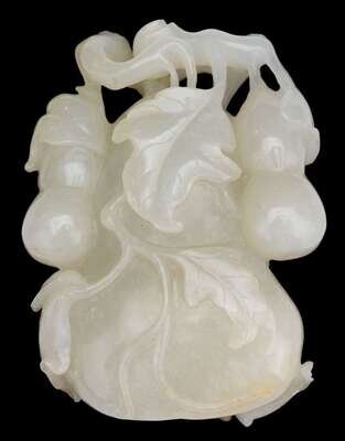 Jade of mottled translucent and white hue, carved as a large and two smaller gourds hanging from the vine.