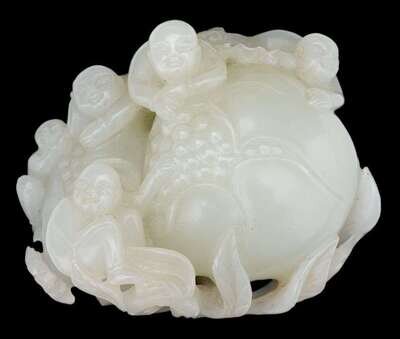 A Chinese white jade carving of children atop of a pomegranate