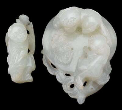 Comprising a small boy and lotus carving and a pendant carved with two squirrels and a fu bat against a flat circular base.