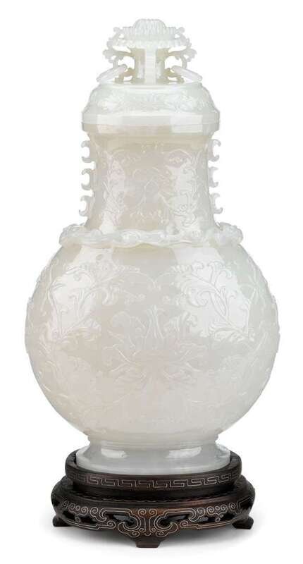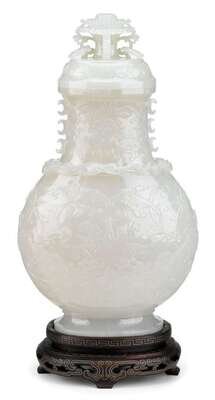 The vase of feathered ovoid form with a series of three raised flanges flanking the side of the neck. The body is carved to show scrolling foliate decor, the vase surmounted with a flower formed finial with two loose rings. The vase supported by a wooden stand.
