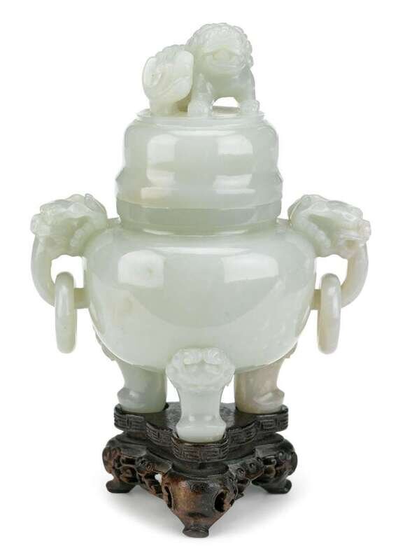 The censer with twin loose ring beast-head handles, supported on beast-head feet and surmounted by a domed cover with fu lion finial.