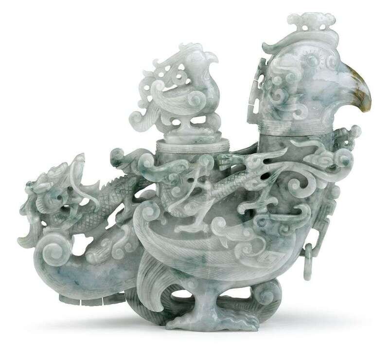 Green mottle tone, the base carved to show mythical bird-like beast, with two conforming covers.