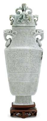 A mottled pale green Chinese jadeite archaistic vase and cover
