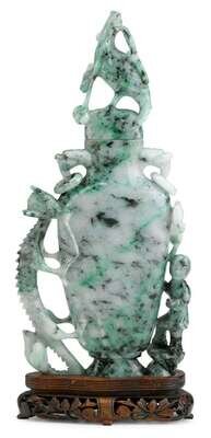 Of flattened ovoid form with loose ring handles and flanked by an extended dragon and figure, surmounted by a phoenix with strands of lingzhi draping out of its mouth. Supported on wooden stand.