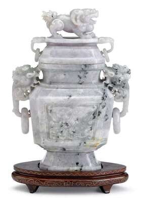 Of flattened ovoid form with lion masks and loose ring handles at shoulder and cover surmounted by a mythical beast. Mounted on wooden stand.