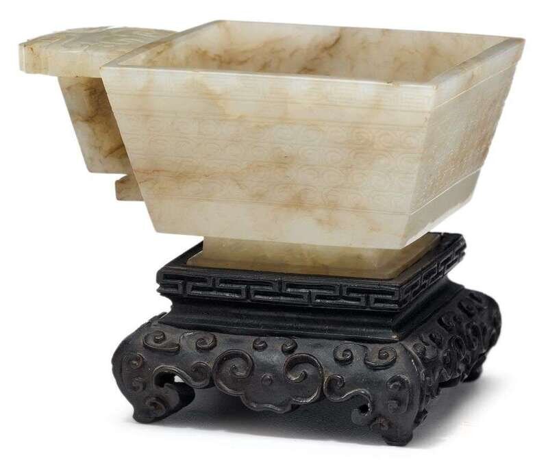 Chinese mottled white, grey and russet jade square cup qing dynasty