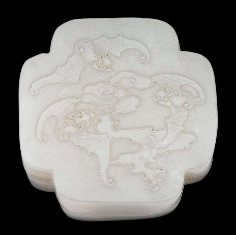 Quartrefoil form carved in low relief with three bats surrounding a lingzhi form cloud to cover.