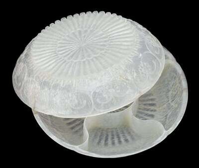 The boxes and covers are finely carved in the form of an open-form chrysanthemum blossom, with foliate patterns along the mouth rims. The stone is of an even pale tone with some snowy inclusions.