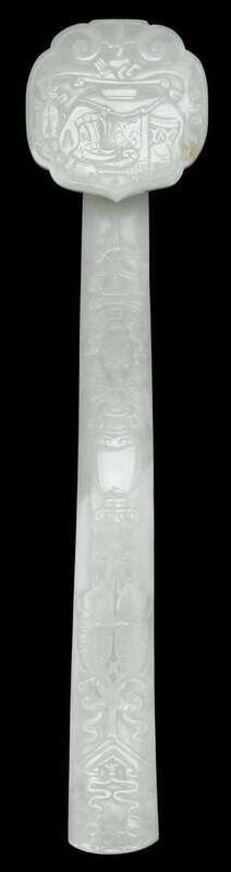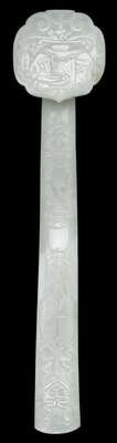 The ruyi head is carved in low relief depicting an elephant while the body is decorated with various Buddhist motifs.