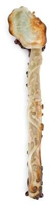Naturalistic lingzhi form entwined with scrolling tendrils, jade with yellow, celadon and russet to brown hues.