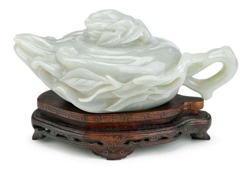 Of citron fruit shape, with a leafy sprig as handle and a small citron fruit as cover knob; jade of pale green hue with occasional inclusions.