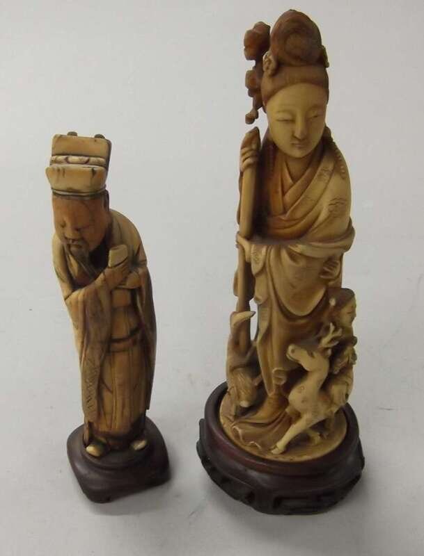 Including an ivory standing dignitary holding a plaque indicating his rank; and a bone standing maiden flanked by dear and crane.