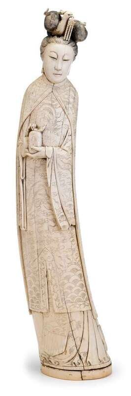 Standing xi wang mu dressed in dragon and phoenix robes holding a case at chest.