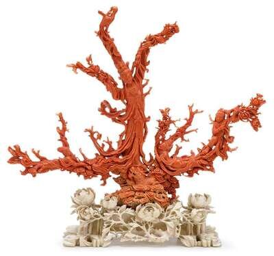 Female figural model of good salmon tone, over well carved peony ivory stand.