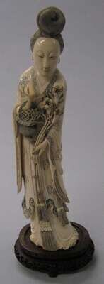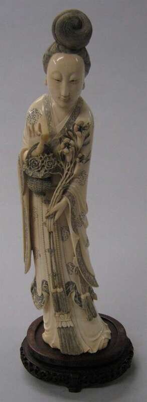 The standing lady with high coiffure dressed in long robes and beaded adornments holds a flower in one hand and a basket in the other.
