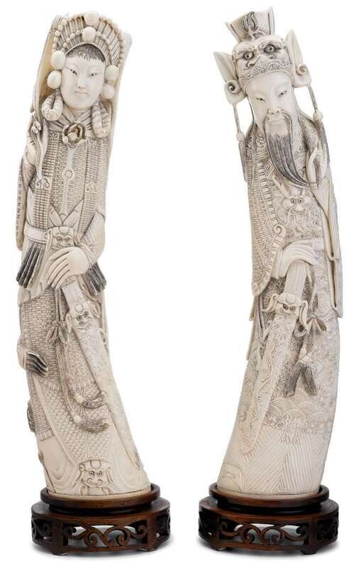 Convex Emperor and Empress figures, with ink-work detail, over wood stand.