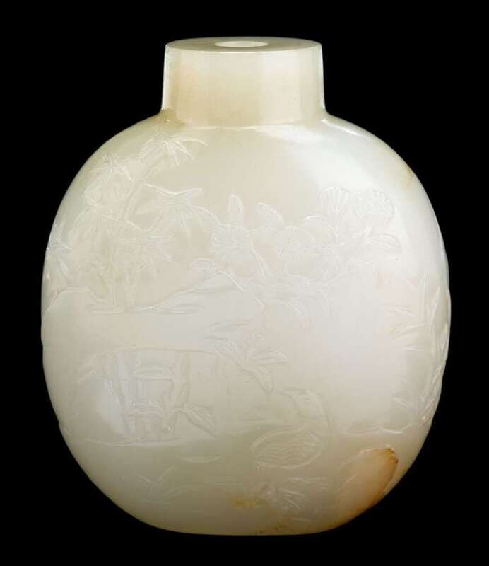 Both sides relief carved with quails under flower blossoms, stone with slight grain inclusions near bottom where it dents slightly.