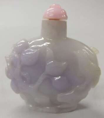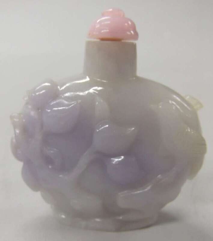 Stout and compressed rectangular form, carved with a continuous scene of bird and flowers in a garden setting, stone of white to pale lavender hue. .