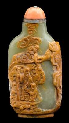 Of flattened rectangular form with russest skin depicting elder and an attendent on a mountain.