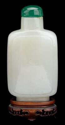 Rectangular bottle with beveled relief panels raised on oblong footring, green glass stopper.