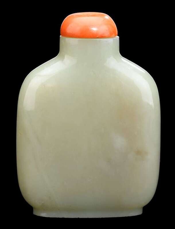 Of pale green hue, slight inclusions, flattened, rounded square shape, the bottle is raised on an oblong foot ring.