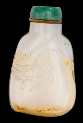 The bottle rounded on one side and incised with orchid and lingzhi sprays, the reverse flat with a thin translucent honey hue skin.