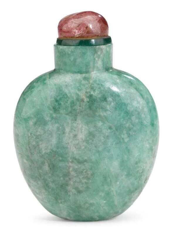 Of flattened ovoid form, mottled green and white hue, surmounted with an amethyst stopper.