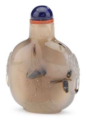 The flattened ovoid bottle is carved in shallow relief through dark inclusion to depict a figure with an incense burner and another figure fishing on the reverse side.