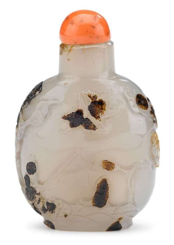 The flattened ovoid bottle is carved in shallow relief through dark inclusions to depict a figure fishing on a riverbank amidst a pair of birds in flight.