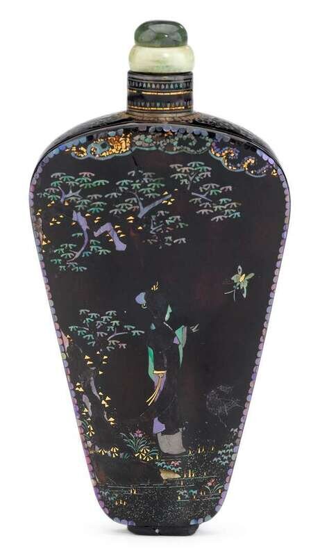 The mother-of-pearl-inlaid burgundy lacquer bottle is of high shouldered tapering rectangular form. The bottle is decorated on one side with a maiden figure watching a butterfly in a garden while the reverse side depicts a butterfly in flight amidst a blooming peony plant.