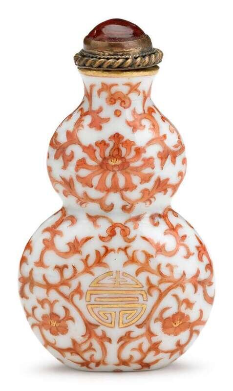 Chinese iron red double gourd snuff bottle qianlong four character mark and of the period