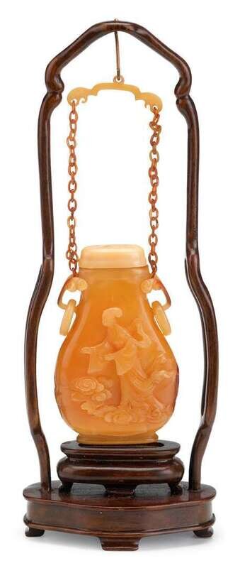 Flat hu form bottle with double ring handles relief carved with a beauty to fornt and inscriptions to verso, chains made form hornbill suspends the bottle on a wood stand.