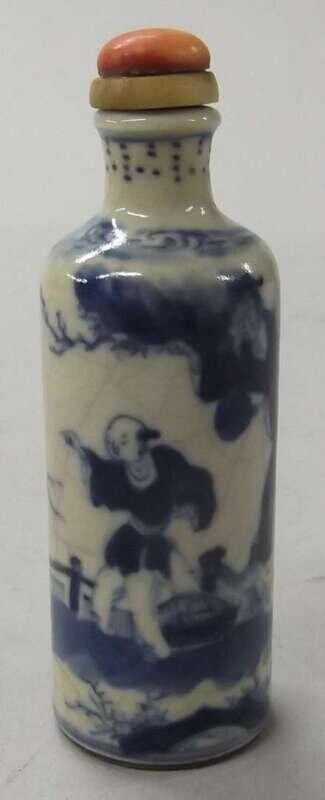 Conical bottle decorated with ladies and a boy within a garden setting, glaze crazing.