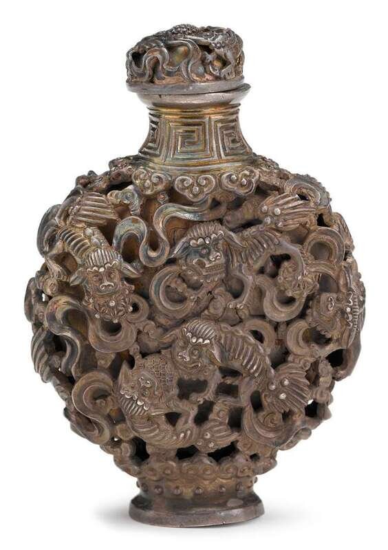 Spade form silver bottle pierced with fu lions and silk balls with ribbons and clouds.