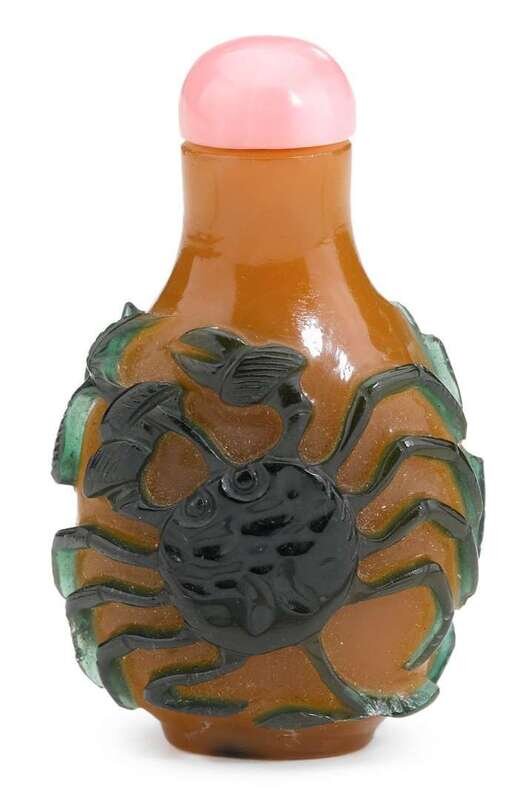 Flattened pear form with long neck, carved through the emerald green overlay with two crabs all against a rich caramel ground.