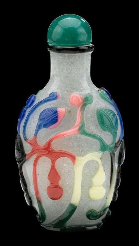 Slender pear form bottle overlay in yellow red pink green and black glass carved as a continuous leafy vein bearing gourd fruits.
