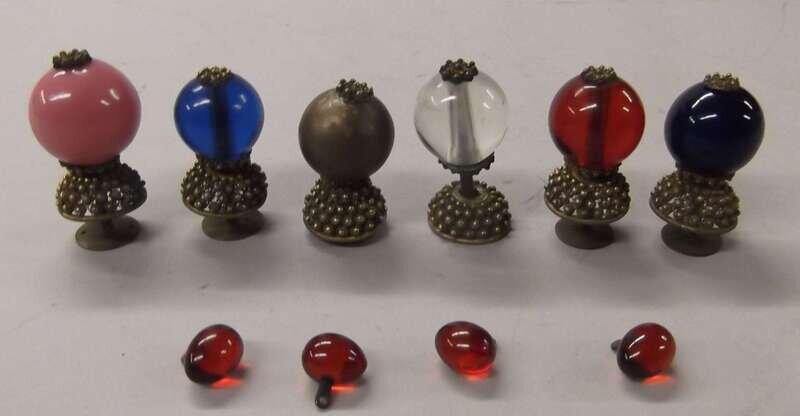Including a transparent, a translucent blue, a translucent ruby, a bronze, an opaque pink and an opaque blue bead all with original chase metal, together with four smaller translucent ruby red egg form beads.
